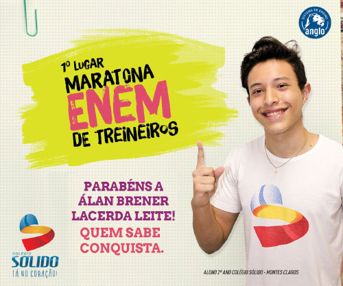 Com 51 acertos, Álan Brener Lacerda Leite, aluno do 2º ano do Colégio Sólido - Unidade Santa Maria, ficou em 1º lugar entre os candidatos de todo o país que prestaram o Provão de Treineiros. Ele será premiado no mês de agosto com um Ipad Mini oferecido pelo Anglo.